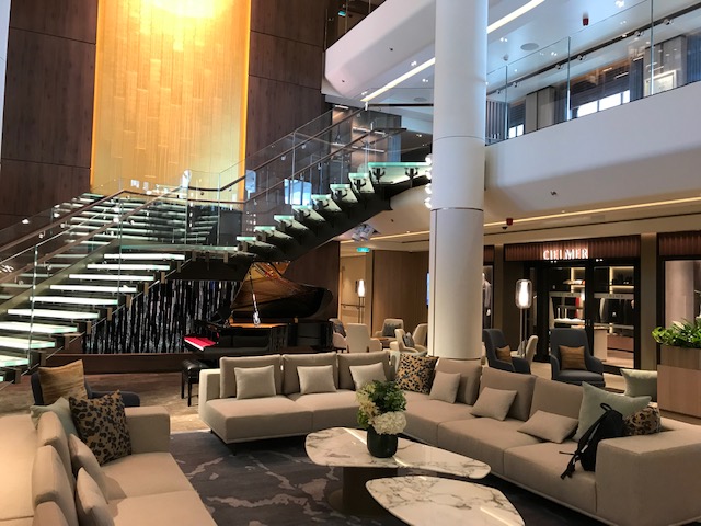 7月4日(金)の見学会には28名の会員の参加があり、12時から13時半まで、2班に分かれて見学をを行いました。まず取材したのは船の中心となるメインアトリウム「アスカプラザ&レセプション」です。金色に輝く壮大な漆芸作品が目を奪うアトリウムは3層吹き抜けの造りになっていて、全体として重厚で落ち着いた雰囲気が感じられました。