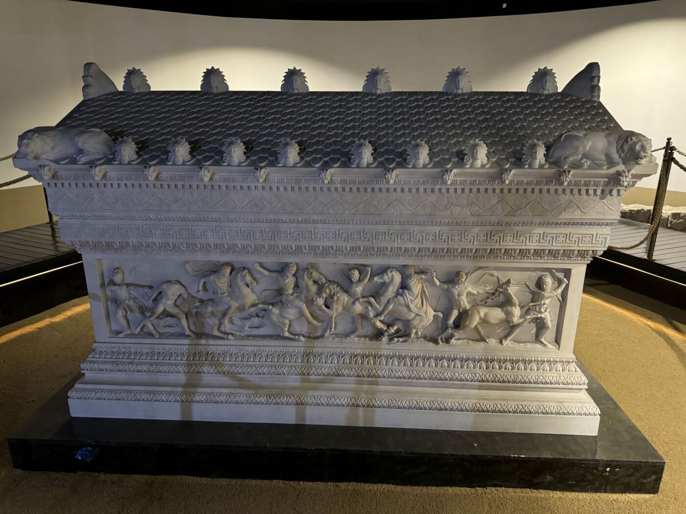天に右手を突き上げるフィリッポス2世立像を目指してオールドマーケットを抜けると、スコピエ2014を具現化した景観が開けます。スコピエ2014とは、ランドマークとなる彫像や泉、橋や博物館を建造する首都整備計画のことです。モニュメント広場にはアレキサンダー大王の父フィリッポス2世立像、アレキサンダー大王立像、オリュンピアスと幼子アレキサンダーの噴水が並んでいます。ヴァルダル川河畔に2014年にオープンした考古学博物館では初期キリスト教のモザイクが展示されています。見所は、最深部に鎮座するアレキサンダー大王の石棺です。例えレプリカとはいえ(イスタンブールの国立考古学博物館に本物があります)魅入られます。マケドニアとペルシアの戦闘、ライオンを狩るレリーフに歴史浪漫を感ぜざるを得ません。見学後、ヴァルダル川にかかるアイ・ブリッジを渡ってマケドニア広場へ。北マケドニアが象徴とするアレキサンダー大王の巨大な騎馬像は圧巻でした。川沿いを歩いてバスに乗り、半日お世話になったローカルガイドのマヤさんとお別れして、昼食をとるレストランへ。街の新旧を知るうえで代表的な場所を巡ったスコピエ半日観光を終えました。