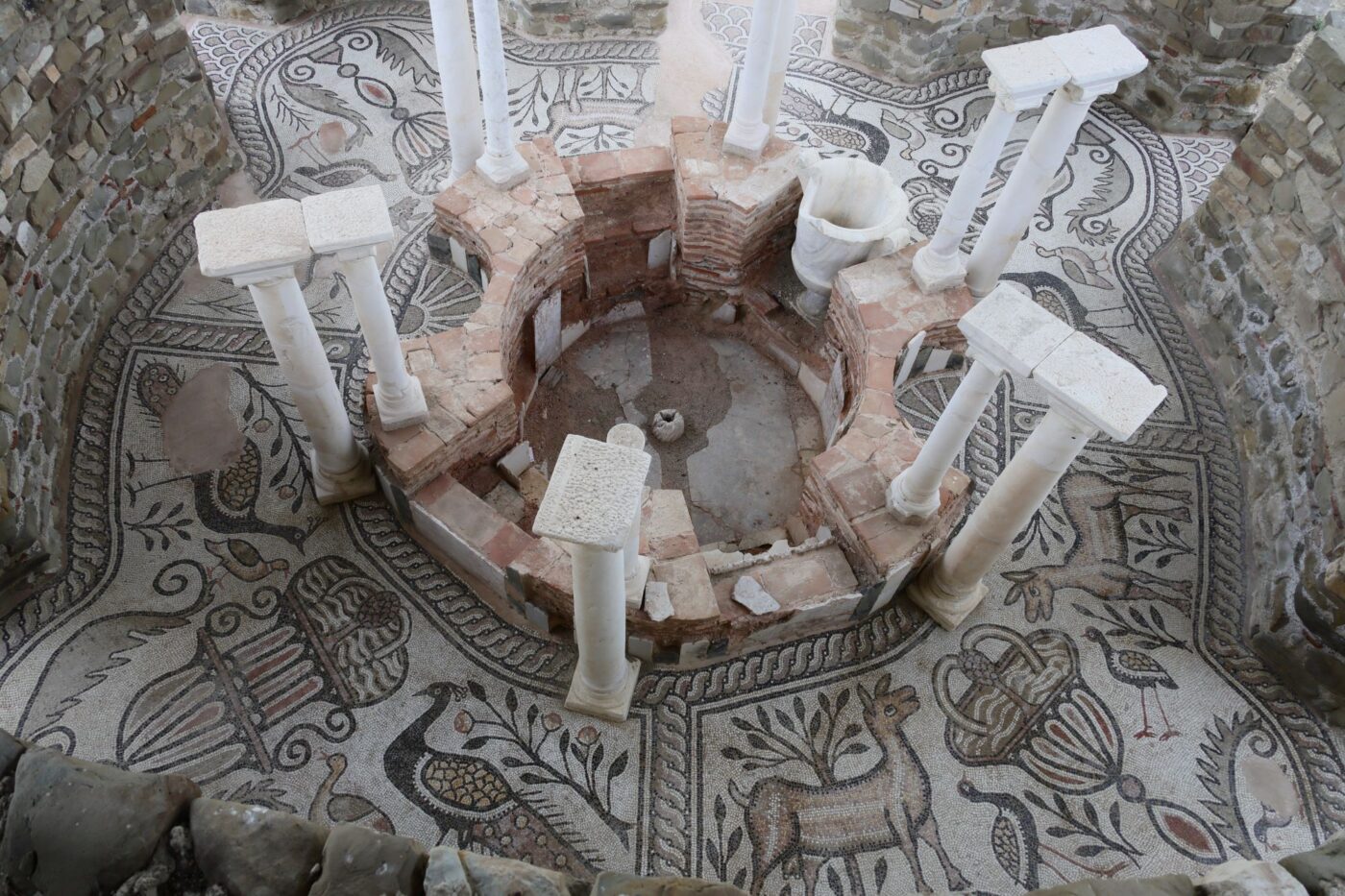 中央の大きな洗礼池は大人用、右上の小さな白い甕が赤ん坊用です。周りを囲む床に描かれているモザイクの孔雀はキリスト教において、不死・復活・救済を表すとともに、蛇を食べることから破邪の象徴とされました。孔雀のモザイクは10マケドニア紙幣のデザインとして用いられています。