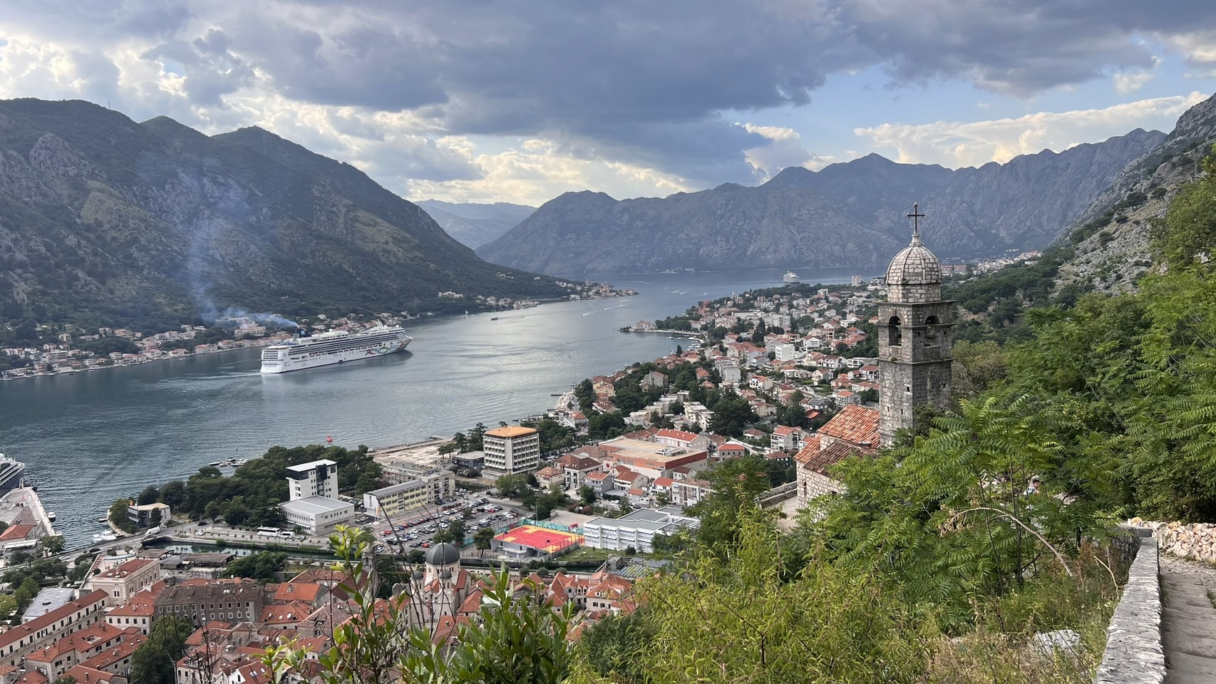 コトル湾の一番奥まった場所にある小さな美しい港町コトル。古代ローマ時代にはすでに街の存在が確認されており、リアス式海岸の自然と中世からの街並みを評価され、1979年にユネスコの世界遺産に登録されている。JTWOバルカンツアー一行はこの街に短時間滞在して帰国の途についたが、私と友人はJTWOメンバーとは別行動で、この街に2泊することにしていた。コトルも城壁に囲まれた街。湾に接したわずかな平地の旧市街の部分のみならず、すぐ後ろの山の頂きにかけてその城壁は続き、ぐるりと一周4.5km。早速、城壁を登れるところまで上ってみようと、入場料を払って歩き始めた。夕刻とはいえまだ日差しが強く気温も高い。汗が噴き出す。急な斜面を登り続けると息がきれる。小さなチャペルがある中腹を過ぎ、せっかく入場料を払ったからと変な“もったいない精神”が出てしまい、結局八合目ぐらいまで登った。コトル湾が一望でき、絶景。港には高級クルーズ船が何艘も入港している。