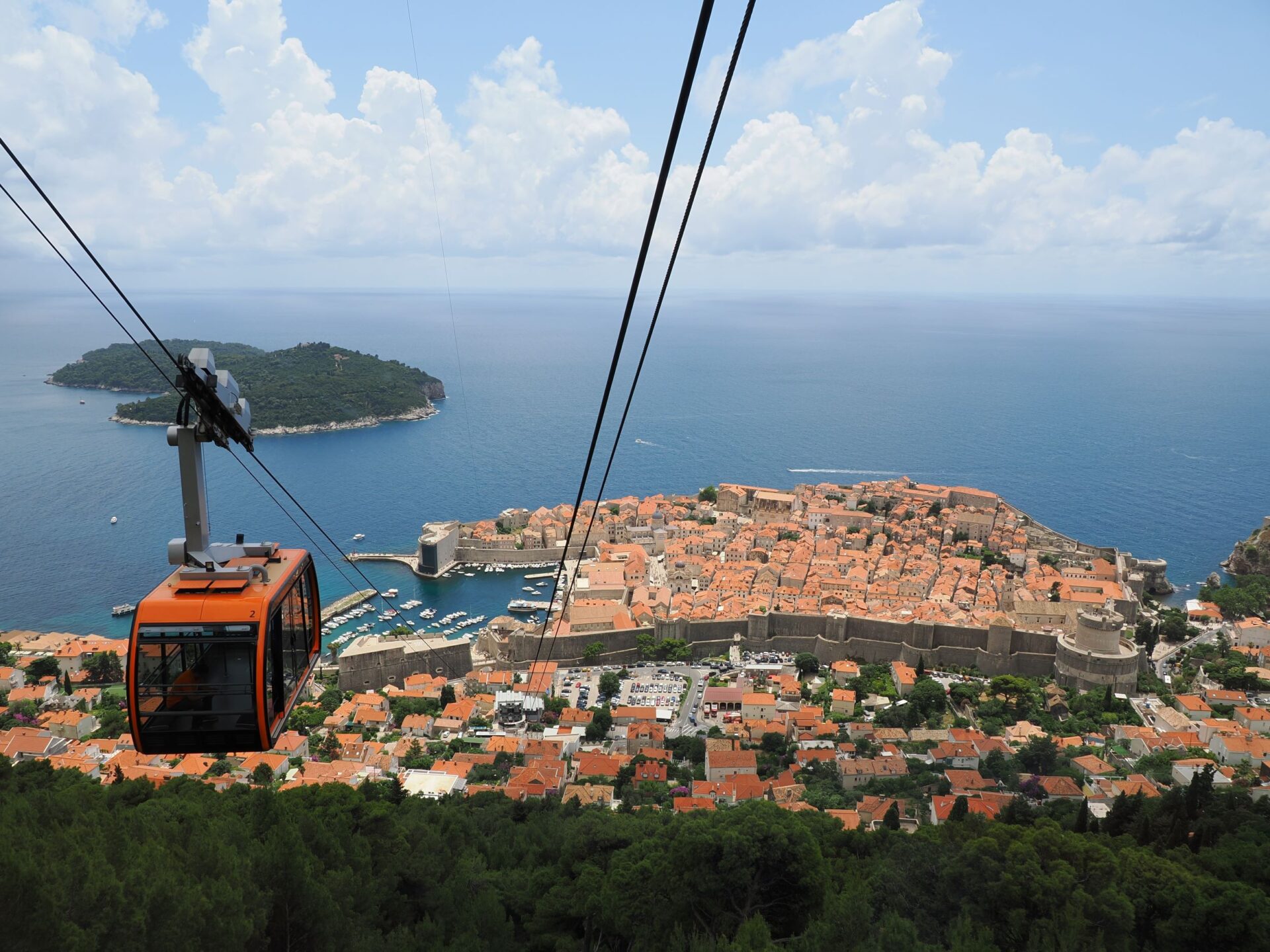 この坂道の大変さは、翌日もかなり味わった。ドゥブロヴニクを一望できるスルジ山に行くべく旧港からロープウェイ(何故か名称はケーブルカー)を目指すが、乗り場までも結構坂道である。朝早めだったせいか、ロープウェイに並んでいる人は思ったより少ないが、乗車券が往復で27ユーロ(約4600円)とはびっくりだ。為替の影響もあるがちょっと取りすぎの感がある。しかし上からの眺めは絶景。楕円形の城壁内にオレンジ屋根の建物がひしめく旧市街、その奥に鎮座する緑のロクルム島、そして青いアドリア海が素晴らしい。頂上ではクロアチア紛争博物館に行く。1991年のクロアチア紛争時の写真や映像がドゥブロヴニクを中心に展示されている。