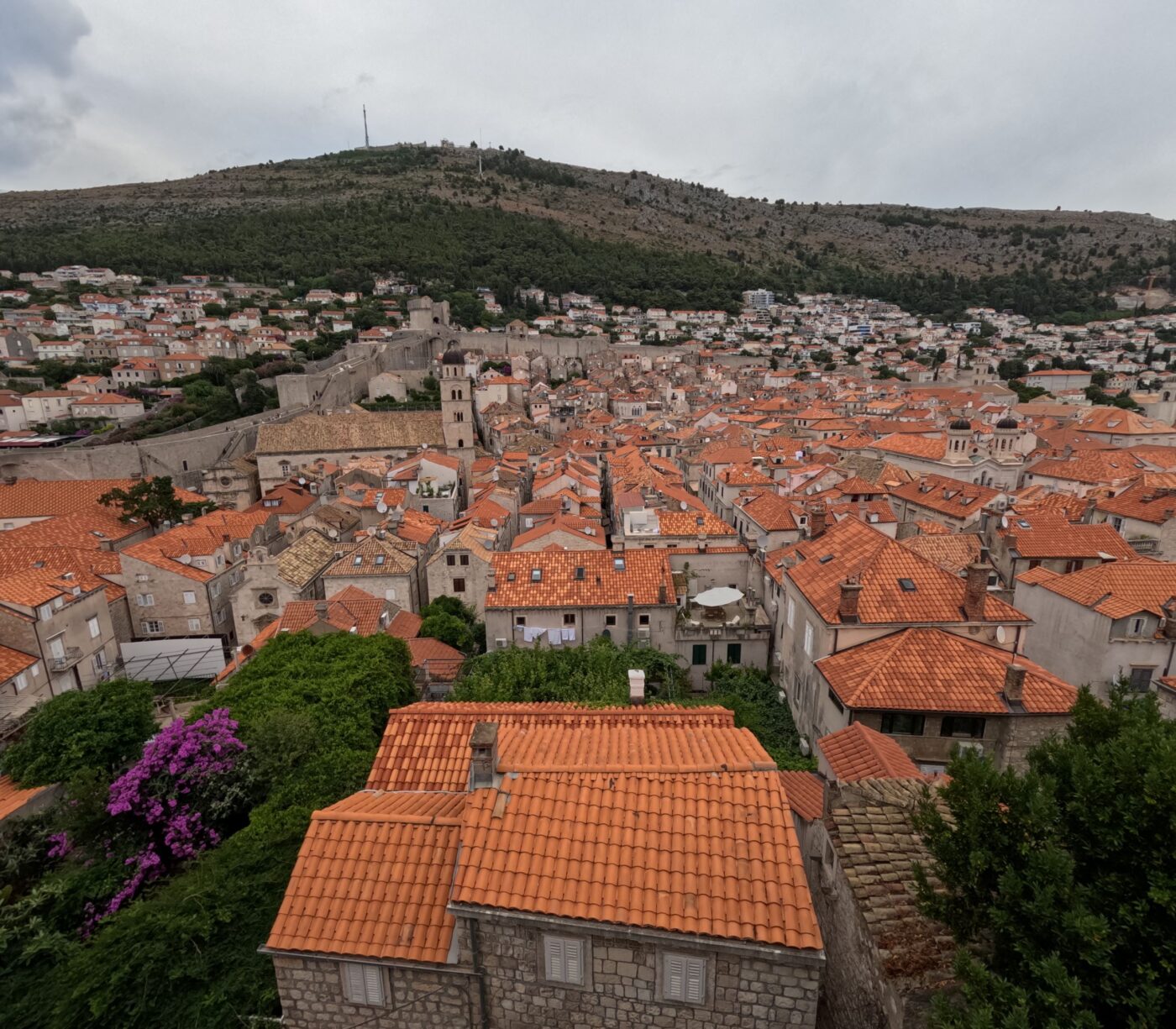 日差しが強く結構ハードであるが、左手に広がる旧市街はどこから見ても絵になる絶景である。18時に複数の教会の鐘が鳴る。少し休みながら目指すミンチェタ砦にやっとたどり着く。確かに眺めは素晴らしいが、肝心の狙っていたアングルの場所がない。あるいは最初に行った砦の博物館からの写真であったのかもしれない。がっくり…。どっと疲れが出てきたが、折角なので下り坂を楽しむことにする。フランシスコ会修道院の古びたテラコッタタイル屋根も趣きがあっていい。